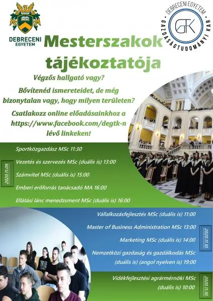 Szeretnénk segíteni Önnek a továbbtanulásban, a megfelelő mesterszak megtalálásában, így ennek érdekében 2020. november 9-13. között online formában a 2021. februárban meghirdetésre kerülő mesterszakokról tájékoztatókat tartunk.